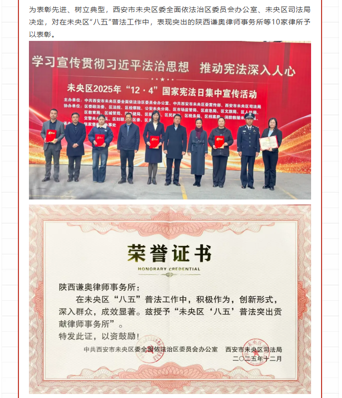 荣誉|谦奥律所被表彰为未央区‘八五’普法突出贡献律师事务所