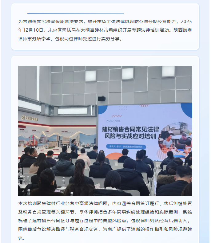 谦奥律师走进大明宫建材市场开展专题培训