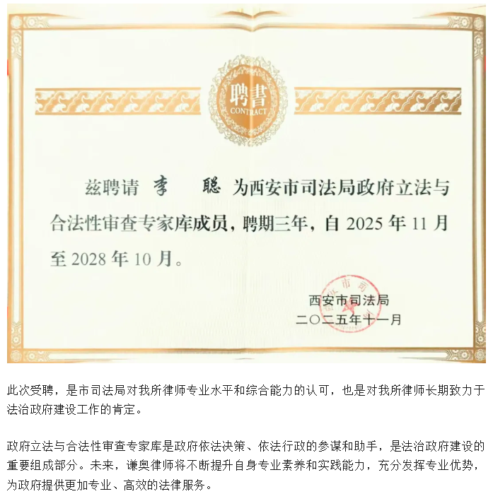 我所主任李聪律师受聘西安市司法局政府立法与合法性审查专家库成员