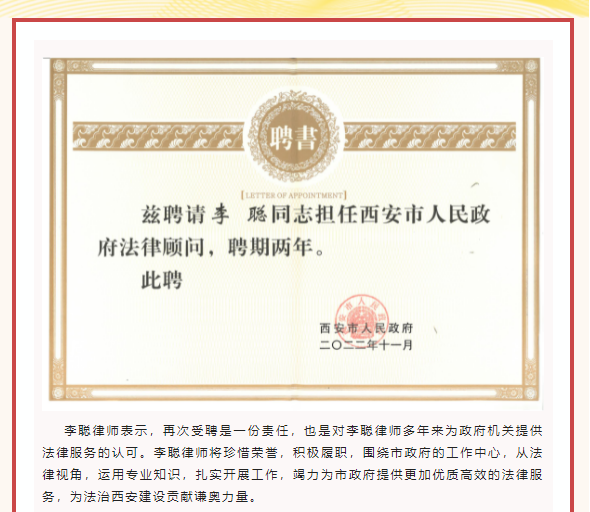 我所主任李聪律师续聘西安市人民政府法律顾问